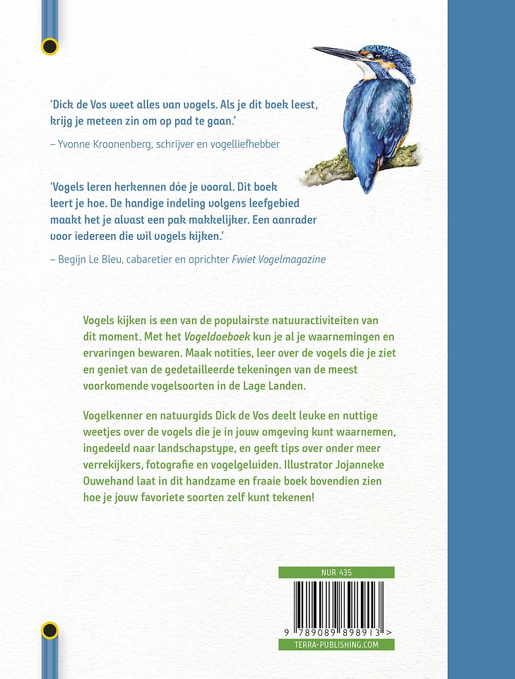Vogelkenner en natuurgids Dick de Vos deelt leuke en nuttige weetjes over de vogels die je in jouw omgeving kunt waarnemen, ingedeeld naar landschapstype, en geeft tips over onder meer verrekijkers, fotografie en vogelgeluiden. Illustrator Jojanneke Ouwehand laat in dit handzame en fraaie boek bovendien zien hoe je jouw favoriete soorten zelf kunt tekenen!