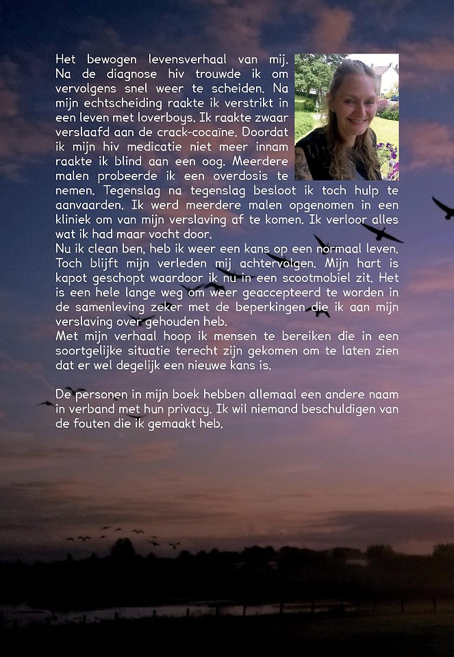 Het bewogen levensverhaal van mij. Na de diagnose hiv trouwde ik om vervolgens snel weer te scheiden. Na mijn echtscheiding raakte ik verstrikt in een leven met loverboys. Ik raakte zwaar verslaafd aan de crack-cocaïne. Doordat ik mijn hiv medicatie niet meer innam raakte ik blind aan een oog. Meerdere malen probeerde ik een overdosis te nemen. Tegenslag na tegenslag besloot ik toch hulp te aanvaarden. Ik werd meerdere malen opgenomen in een kliniek om van mijn verslaving af te komen. Ik verloor alles wat ik had maar vocht door.