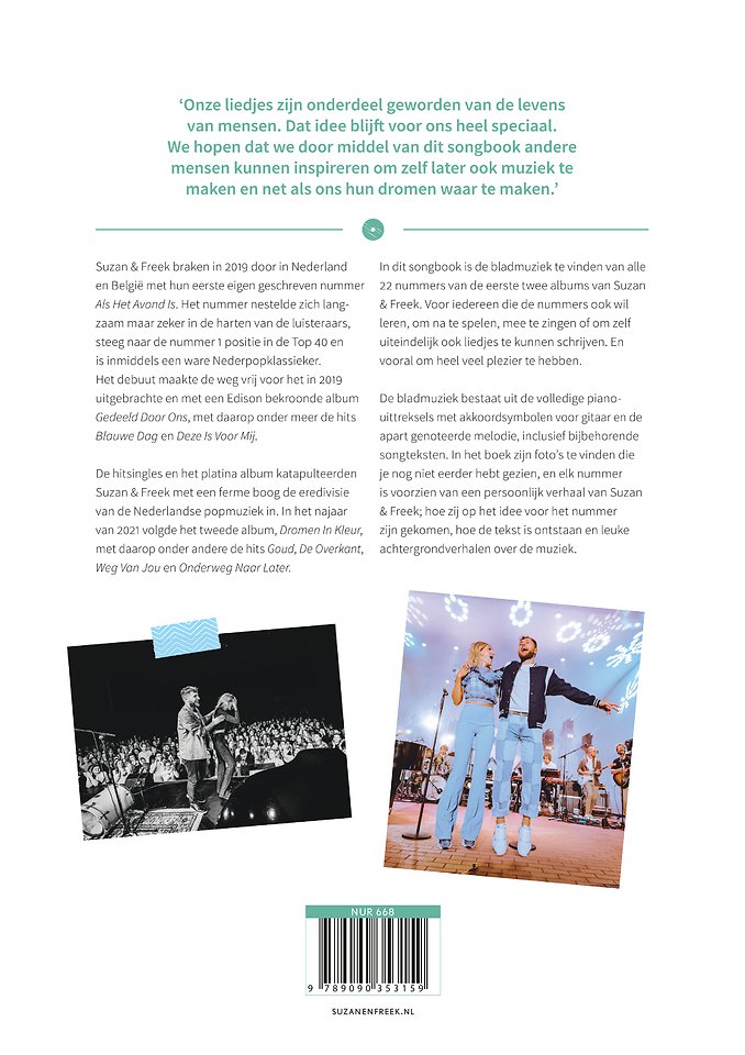 In dit songbook is de bladmuziek te vinden van alle 22 nummers van de eerste twee albums van Suzan & Freek. Voor iedereen die de nummers ook wil leren, om na te spelen, mee te zingen of om zelf uiteindelijk ook liedjes te kunnen schrijven. En vooral om heel veel plezier te hebben.