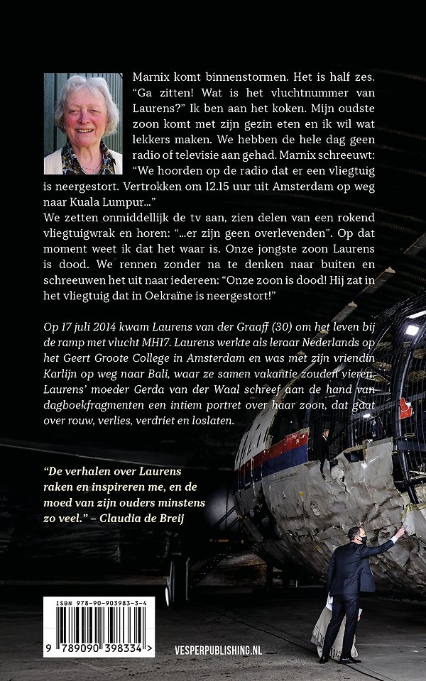 Op 17 juli 2014 kwam Laurens van der Graaff (30) om het leven bij de ramp met vlucht MH17. Laurens werkte als leraar Nederlands op het Geert Groote College in Amsterdam en was met zijn vriendin Karlijn op weg naar Bali, waar ze samen vakantie zouden vieren. Laurens’ moeder Gerda van der Waal (1947) schreef aan de hand van dagboekfragmenten een intiem portret over haar zoon, dat gaat over rouw, verlies, verdriet en loslaten.