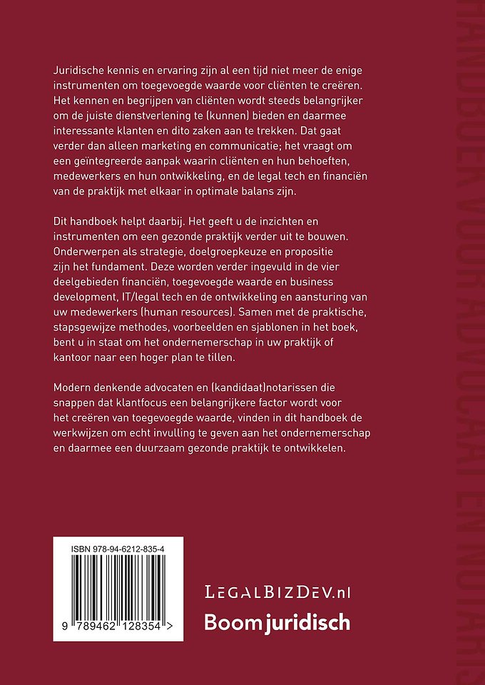 Modern denkende advocaten en (kandidaat)notarissen die snappen dat klantfocus een belangrijkere factor wordt voor het creëren van toegevoegde waarde, vinden in dit handboek de werkwijzen om echt invulling te geven aan het ondernemerschap en daarmee een duurzaam gezonde praktijk te ontwikkelen.