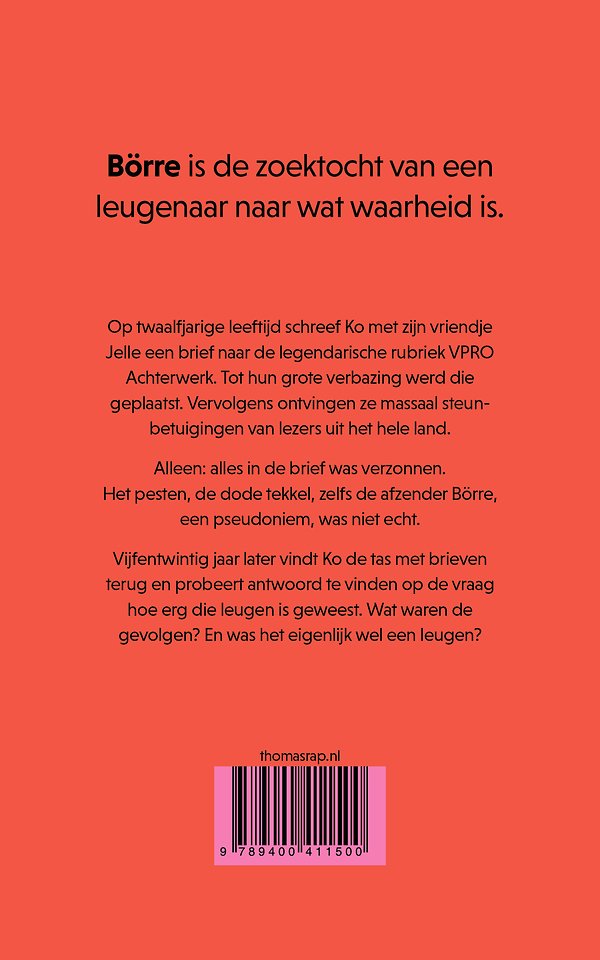 Op twaalfjarige leeftijd schreef Ko met zijn vriendje Jelle een brief naar de legendarische rubriek VPRO Achterwerk. Tot hun grote verbazing werd die geplaatst. Vervolgens ontvingen ze massaal steunbetuigingen van lezers uit het hele land. Alleen: alles in de brief was verzonnen. Het pesten, de dode teckel, zelfs de afzender Börre, een pseudoniem, was niet echt. Vijfentwintig jaar later vindt Ko de steunbetuigingen uit 1998 terug in een V&D-tas op de zolder van zijn ouders en probeert hij antwoord te vinden op de vraag hoe erg die leugen is geweest. Wat waren de gevolgen? En was het eigenlijk wel een leugen?