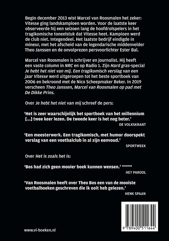 Begin december 2013 wist Marcel van Roosmalen het zeker: Vitesse ging landskampioen worden. Voor de laatste keer observeerde hij een seizoen lang de hoofdrolspelers in het tragikomische toneelstuk dat Vitesse heet. Kampioen werd de club niet. Integendeel. Het laatste bedrijf eindigde in mineur, met het afscheid van de legendarische middenvelder Theo Janssen en de onvolprezen persvoorlichter Ester Bal.