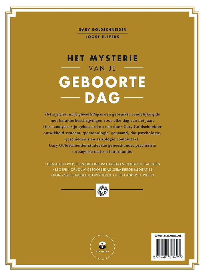 'Het mysterie van je geboortedag' is een gebruiksvriendelijke gids met karakterbeschrijvingen voor elke dag van het jaar. Deze analyses zijn gebaseerd op een door Gary Goldschneider ontwikkeld systeem, 'personologie' genaamd, dat stoelt op een combinatie van psychologie, geschiedenis en astrologie. Lees alles over je unieke eigenschappen en ontdek je talenten, eoefen op jouw geboortedag gebaseerde meditaties en kom zoveel mogelijk over jezelf of een ander te weten.
