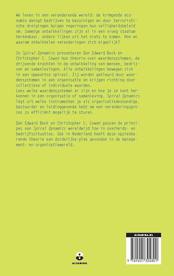 'Spiral Dynamics' geeft antwoord op vragen als 'Hoe kan ik zien welke drijvende krachten een rol spelen bij veranderingen?', 'In welke richting beweegt zich dat veranderingsproces?' en 'Welk instrument heb ik om dat proces te sturen?'. Spiral Dynamics is een door Don Beck en Chris Cowan ontwikkeld strategisch model om grip te krijgen op de dynamische krachten achter het menselijk handelen. Alle veranderingsprocessen - in de zakenwereld, in persoonlijke relaties, in het onderwijs en op het terrein van de politiek - bewegen zich in dit dynamische model spiraalvormig omhoog. Ze worden gekleurd door de waardesystemen die leven in een organisatie.