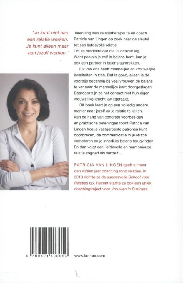 Een opvallend pleidooi om opnieuw vrouw te durven zijn Jarenlang was relatietherapeute en coach Patricia van Lingen op zoek naar de sleutel tot een liefdevolle relatie. Tot ze ontdekte dat die in zichzelf lag. Want pas als je zelf in balans bent, kun je ook een partner in balans aantrekken. Elk van ons heeft mannelijke en vrouwelijke kwaliteiten in zich. Dat is goed, alleen is de voorbije decennia bij veel vrouwen de balans te veel naar de mannelijke kant doorgeslagen. Daardoor zijn ze het contact met hun eigen vrouwelijke kracht kwijtgeraakt. Dit boek leert je op een volledig andere manier naar jezelf en je relatie te kijken. Aan de hand van concrete voorbeelden en praktische oefeningen toont Patricia van Lingen hoe je vastgeroeste patronen kunt doorbreken, de communicatie in je relatie verbeteren en je innerlijke balans terugvinden. En dan volgt een liefdevolle en harmonieuze relatie zogoed als vanzelf...