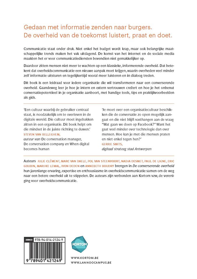 Dit boek is een leidraad voor iedere organisatie die wil transformeren naar een converserende overheid. Gaandeweg leer je hoe je intern en extern vertrouwen creëert en hoe je het onbenut conversatiepotentieel in je organisatie aanboort, met handige tools, tips en praktijkvoorbeelden als gids.