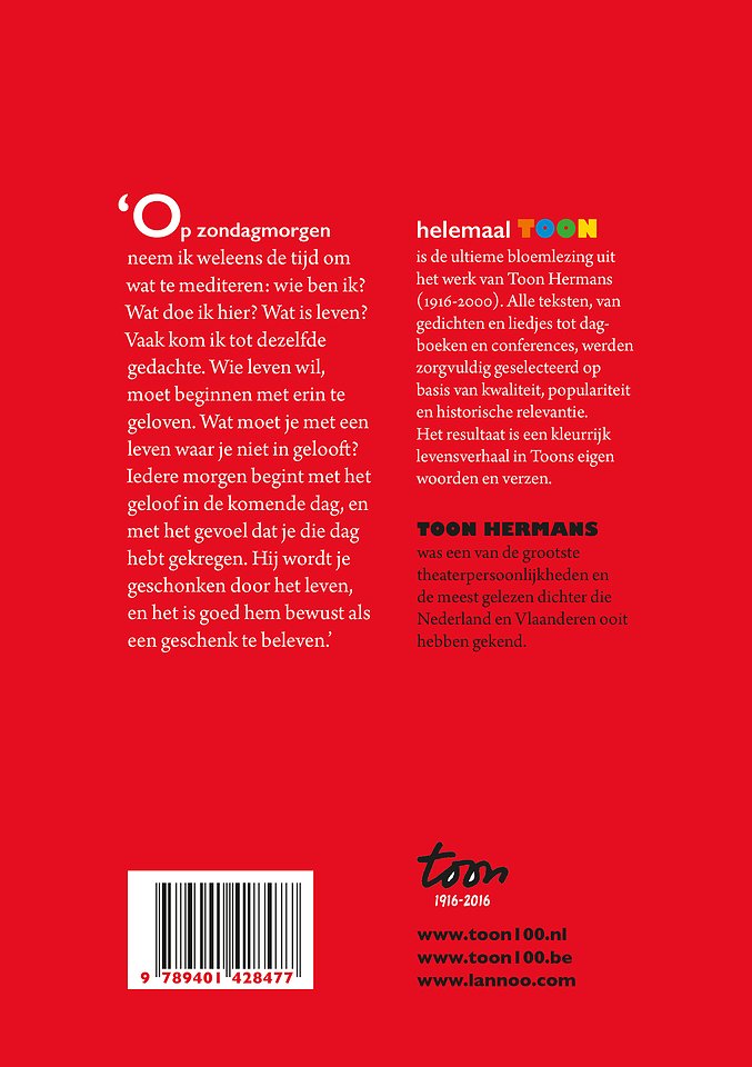 Een chronologische selectie uit alle gedichten, liedjes, prozawerk, dagboeken en conferences 'Op zondagmorgen neem ik weleens de tijd om wat te mediteren: wie ben ik? Wat doe ik hier? Wat is leven? Vaak kom ik tot dezelfde gedachte. Wie leven wil, moet beginnen met erin te geloven. Wat moet je met een leven waar je niet in gelooft? Iedere morgen begint met het geloof in de komende dag, en met het gevoel dat je die dag hebt gekregen. Hij wordt je geschonken door het leven, en het is goed hem bewust als een geschenk te beleven.' helemaal TOON is de ultieme bloemlezing uit het werk van Toon Hermans (1916-2000). Alle teksten, van gedichten en liedjes tot dagboeken en conferences, werden zorgvuldig geselecteerd op basis van kwaliteit, populariteit en historische relevantie. Het resultaat is een kleurrijk levensverhaal in Toons eigen woorden en verzen. Toon Hermans was een van de grootste theaterpersoonlijkheden en de meest gelezen dichter die Nederland en Vlaanderen ooit hebben gekend.