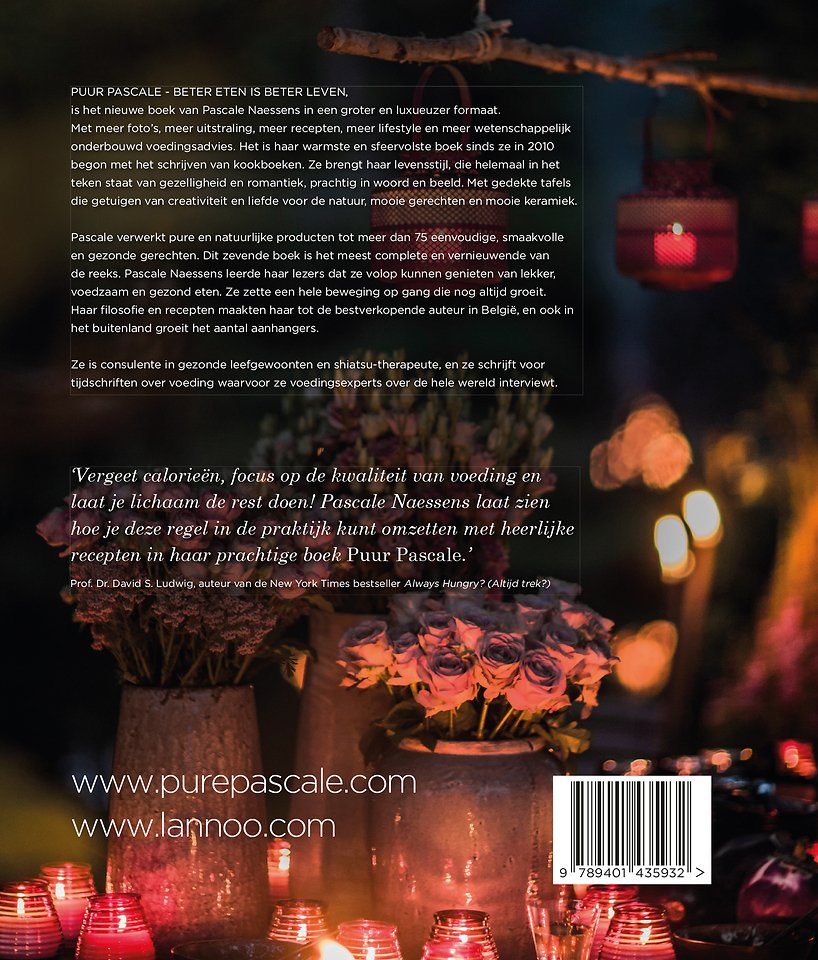 Het mooiste en meest complete boek van Pascale Naessens Puur Pascale - Beter eten is beter leven, is het nieuwe boek van Pascale Naessens in een groter en luxueuzer formaat. Met meer foto's, meer uitstraling, meer recepten, meer lifestyle en meer wetenschappelijk onderbouwd voedingsadvies. Het is haar warmste en sfeervolste boek sinds ze in 2010 begon met het schrijven van kookboeken. Ze brengt haar levensstijl, die helemaal in het teken staat van gezelligheid en romantiek, prachtig in woord en beeld. Met gedekte tafels die getuigen van creativiteit en liefde voor de natuur, mooie gerechten en mooie keramiek. Pascale verwerkt pure en natuurlijke producten tot meer dan 75 eenvoudige, smaakvolle en gezonde gerechten. Dit zevende boek is het meest complete en vernieuwende van de reeks. Pascale Naessens leerde haar lezers dat ze volop kunnen genieten van lekker, voedzaam en gezond eten. Ze zette een hele beweging op gang die nog steeds groeit. Haar filosofie en recepten maakten haar tot de bestverkopende auteur in België, en ook in het buitenland groeit het aantal aanhangers. Ze is consulente in gezonde leefgewoonten en shiatsu-therapeute, en ze schrijft voor tijdschriften over voeding waarvoor ze voedingsexperts over de hele wereld interviewt. 'Vergeet calorieën, focus op de kwaliteit van voeding en laat je lichaam de rest doen! Pascale Naessens laat zien hoe je deze regel in de praktijk kunt omzetten met heerlijke recepten in haar prachtige boek Puur Pascale.' Prof. Dr. David S. Ludwig, auteur van de New York Times bestseller Always hungry? (Altijd trek?)