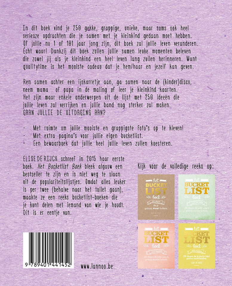 In dit boek vind je 250 gekke, grappige, unieke, maar soms ook heel serieuze opdrachten die je samen met je kleinkind gedaan moet hebben. Of jullie nu 1 of 101 jaar jong zijn, dit boek zal jullie leven veranderen. Écht waar! Dankzij dit boek zullen jullie samen leuke momenten beleven die zowel jij als je kleinkind een heel leven lang zullen herinneren. Want qualitytime is het mooiste cadeau dat je hem/haar en jezelf kan geven. Ren samen achter een ijskarretje aan, ga samen naar de (kinder)disco, neem mama of papa in de maling of leer je kleinkind kaarten. Het zijn maar enkele onderwerpen uit de lijst met 250 ideeën die jullie leven zal verrijken en jullie band nog sterker zal maken. GAAN JULLIE DE UITDAGING AAN? - Met ruimte om jullie mooiste en grappigste foto's op te kleven! - Met extra pagina's voor jullie eigen bucketlist. - Een bewaarboek dat jullie heel jullie leven zullen koesteren.