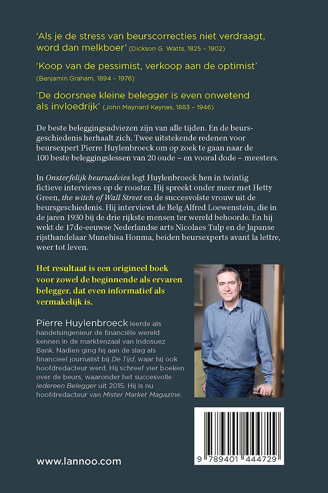 Omdat Huylenbroeck zoveel positieve reacties kreeg op de fictieve interviews met dode beursexperts in zijn beleggersmagazine Mister Market, besloot hij ze in een boek samen te brengen. Want ook de beursgeschiedenis herhaalt zich en de beste beleggingsadviezen zijn van alle tijden.Huylenbroeck spreekt met onder meer Hetty Green, Witch of Wall Street, de succesvolste vrouw uit de beursgeschiedenis.