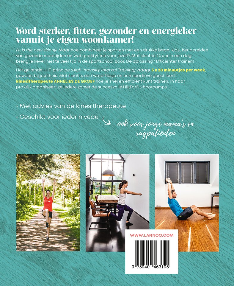 Het gekende HIIT-principe (High Intensity Interval Training) vraagt 3 x 20 minuutjes per week, gewoon bij jou thuis. Met slechts een waterflesje en een sportieve geest leert kinesitherapeute Annelies De Groef hoe je snel en efficiënt kunt trainen. In haar praktijk organiseert ze iedere zomer de succesvolle HiitForFit-bootcamps. Met advies van de kinesitherapeute Geschikt voor ieder niveau > ook voor jonge mama's en rugpatiënten