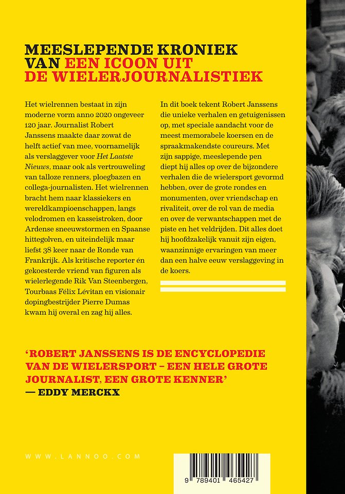 Het wielrennen bestaat in zijn moderne vorm anno 2020 ongeveer 120 jaar. Journalist Robert Janssens maakte daar zowat de helft actief van mee, voornamelijk als verslaggever voor Het Laatste Nieuws, maar ook als vertrouweling van talloze renners, ploegbazen en collega-journalisten. Het wielrennen bracht hem naar klassiekers en wereldkampioenschappen, langs velodromen en kasseistroken, door Ardense sneeuwstormen en Spaanse hittegolven, en uiteindelijk maar liefst 38 keer naar de Ronde van Frankrijk. Als kritische reporter én gekoesterde vriend van figuren als wielerlegende Rik Van Steenbergen, Tourbaas Félix Lévitan en visionair dopingbestrijder Pierre Dumas kwam hij overal en zag hij alles.