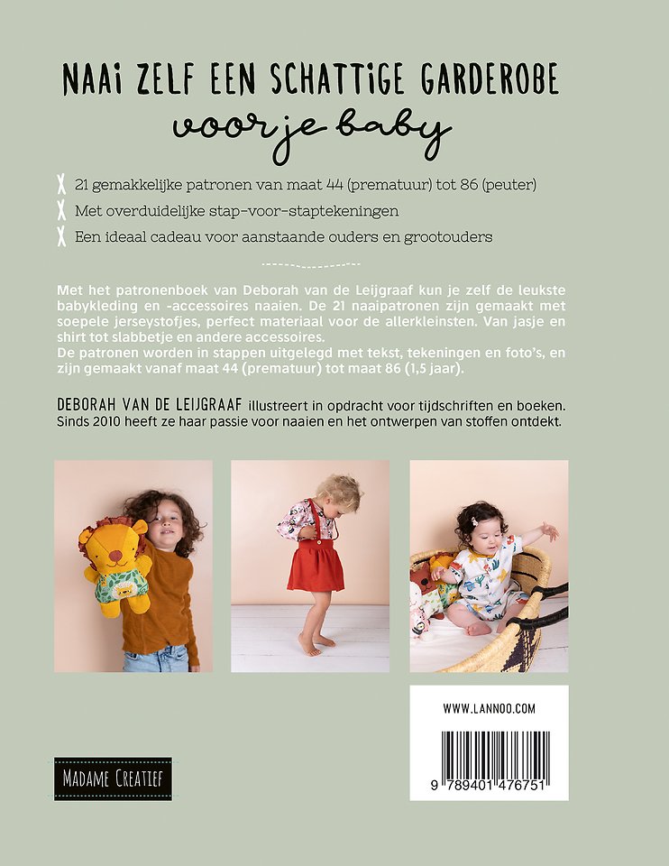Met het patronenboek van Deborah van de Leijgraaf kun je zelf de leukste babykleding en accessoires naaien. De 21 naaipatronen zijn gemaakt met soepele jerseystofjes, perfect materiaal voor de allerkleinsten. Van jasje en shirt tot slabbetje en andere accessoires. De patronen worden in stappen uitgelegd met tekst, tekeningen en foto's, en zijn gemaakt vanaf maat 44 (prematuur) tot maat 86 (1,5 jaar).