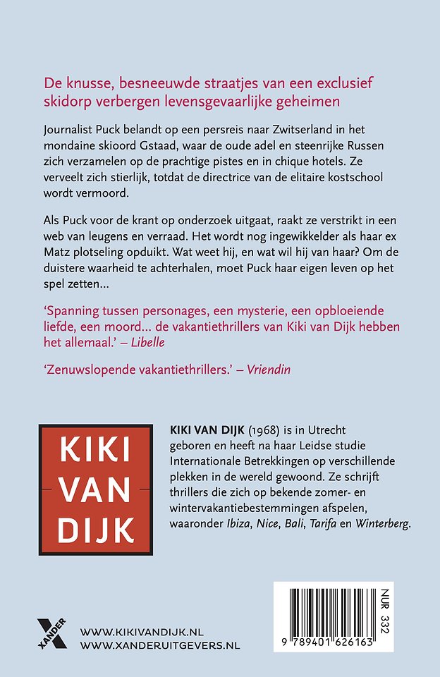In de spannende winterthriller Gstaad van bestsellerauteur Kiki van Dijk belandt de introverte journalist Puck op een persreis naar Zwitserland in het mondaine skioord Gstaad, waar de oude adel en steenrijke Russen zich verzamelen in de besneeuwde straatjes en chique hotels. Ze verveelt zich stierlijk, totdat de directrice van de elitaire kostschool wordt vermoord.