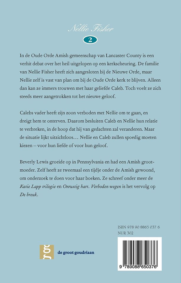 Deel 2 `Verboden wegen`. De populaire Nellie Fisher-serie van de Amerikaanse schrijfster Beverly Lewis is nu gebundeld in een trilogie. Hoofdpersoon Nellie Fisher bevindt zich in een moeilijke positie als haar familie overweegt zich af te scheiden van de Amish-kerk. Als dat gebeurt, verliest Nellie haar geliefde Caleb. Hij houdt namelijk vast aan de wegen van de Old Order-gemeenschap. Maar als Nellie voor Caleb kiest, moet ze haar familie loslaten. Is er een uitweg voor haar dilemma? De Nellie Fisher trilogie van Beverly Lewis bevat de titels De breuk, Verboden wegen en Diepste verlangen.
