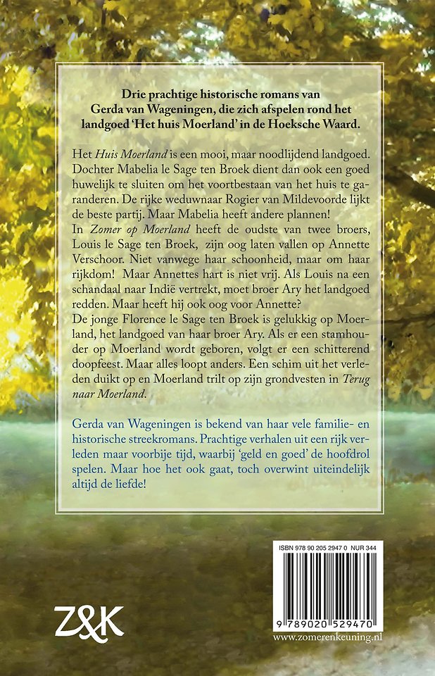‘Zomer op Moerland’ van Gerda van Wageningen is het tweede deel in de meeslepende Moerland Trilogie. Annette Verschoor is de rijke erfgename van een wijnhuis en bezit tevens een grote herenboerderij vlak bij Moerland. Hoewel ze niet knap is, komen er veel jongemannen op bezoek die maar wat graag willen trouwen met de rijke erfgename. Maar Annette heeft alleen oog voor Ary, de tweede zoon van een adellijke familie. Ary is echter al verloofd. Als er problemen zijn in zijn familie, blijkt Annette een ware steun voor Ary. Zou hun vriendschap ooit kunnen uitgroeien tot meer? ‘Zomer op Moerland’ is opnieuw een romantische, historische roman van Gerda van Wageningen, die nieuwsgierig maakt naar het derde en laatste deel ‘Terug naar Moerland’.