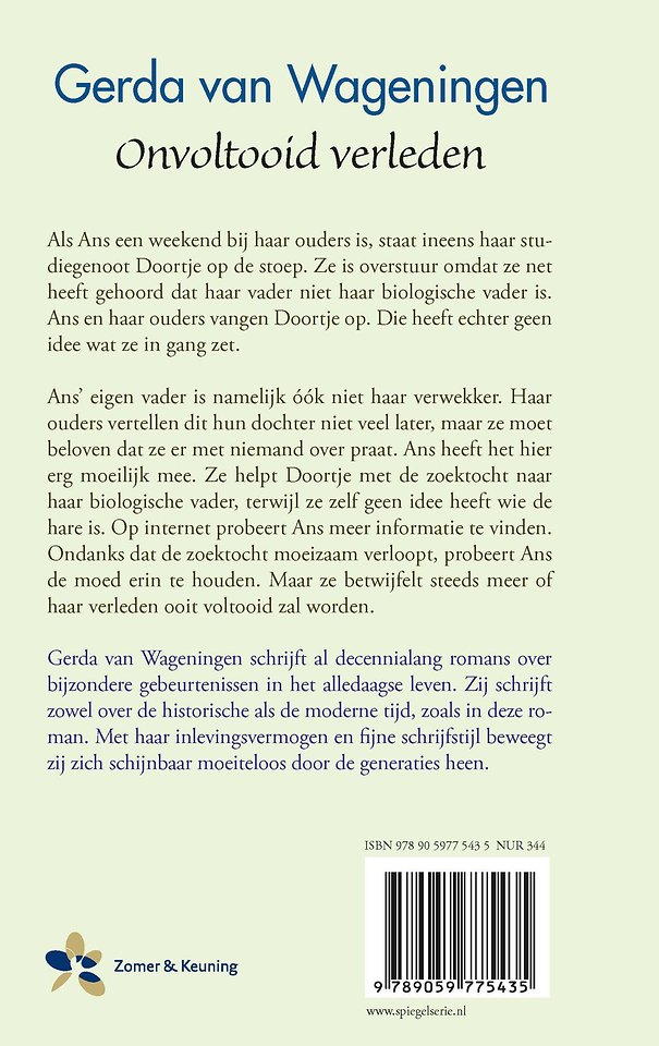 De moderne familieroman ‘Onvoltooid verleden’ van Gerda van Wageningen speelt zich af in Leiden, waar rechtenstudenten Ans en Doortje een studentenhuis en lief en leed met elkaar delen. Als Ans een weekend bij haar ouders is, staat Doortje ineens op de stoep. Ze is overstuur omdat ze net heeft gehoord dat haar vader niet haar biologische vader is. Ans en haar ouders vangen Doortje op. Die heeft echter geen idee wat ze in gang zet. Ans’ eigen vader is namelijk óók niet haar verwekker. Ans moet haar ouders beloven dat ze er met niemand over praat, maar heeft het hier erg moeilijk mee. De zoektocht naar Ans’ biologische vader verloopt moeizaam en ze betwijfelt steeds meer of haar verleden ooit voltooid zal worden. Gerda van Wageningen slaagt er met ‘Onvoltooid verleden’ opnieuw in een heerlijk én realistisch verhaal neer te zetten over een probleem van deze tijd.
