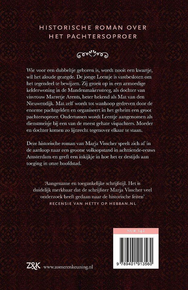 ‘Het meisje uit de Mandenmakerssteeg’ is een historische roman van Marja Visscher. Wie voor een dubbeltje geboren is, wordt nooit een kwartje? De jonge Leentje is vastbesloten om het tegendeel te bewijzen. Zij groeit op in een armoedige kelderwoning, als dochter van een visvrouw. Haar moeder, Mat, wordt tot wanhoop gedreven door de enorme pachtgelden en organiseert in het geheim een groot pachtersoproer. Ondertussen wordt Leentje aangenomen als dienstmeisje bij een van de meest gehate vispachters. Moeder en dochter komen zo lijnrecht tegenover elkaar te staan. ‘Het meisje uit de Mandenmakerssteeg’ van Marja Visscher is een tijdloos verhaal tegen het decor van het Amsterdamse Pachtersoproer in 1748.
