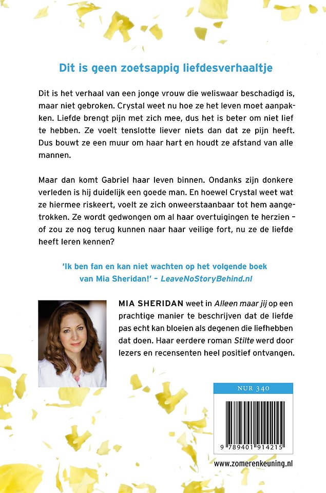 ‘Alleen maar jij’ van Mia Sheridan is geen zoetsappig liefdesverhaaltje. Het is het verhaal van een jonge vrouw die weliswaar beschadigd is, maar niet geknakt. Wanneer hoofdpersoon Crystal de mooie Gabriel ontmoet, wordt ze verliefd op hem. Maar ze vindt dat ze eerst zichzelf moet vinden, voor ze een liefdesrelatie met hem kan aangaan. ‘Alleen maar jij’, ja, maar dat kan niet zonder ‘ik’. Mia Sheridan weet op een prachtige manier te beschrijven dat de liefde pas kan bloeien als degene die liefheeft dat doet.