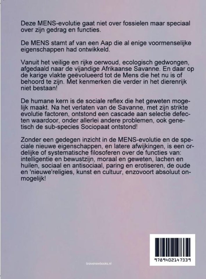 Zonder een gedegen inzicht in de MENS-evolutie en de speciale nieuwe eigenschappen, en latere afwijkingen, is een ordelijke of systematische filosoferen over de functies van: Intelligentie en bewustzijn, moraal en geweten, lachen en huilen, sociaal en antisociaal, paring en erotiseren, de oude en 'nieuwe' religies, kunst en cultuur, enzovoort., absoluut onmogelijk!