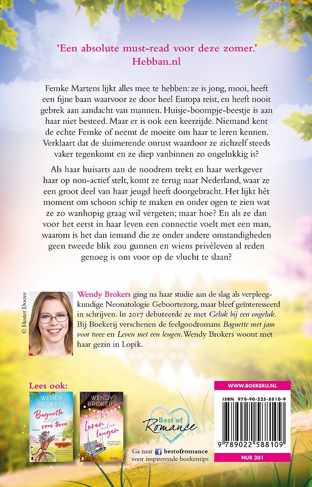 Maar er is ook een keerzijde. Niemand kent de echte Femke of neemt de moeite om haar te leren kennen. Verklaart dat de sluimerende onrust waardoor ze zichzelf steeds vaker tegenkomt en ze diep vanbinnen zo ongelukkig is? Als haar huisarts aan de noodrem trekt en haar werkgever haar op non-actief stelt, komt ze terug naar Nederland, waar ze een groot deel van haar jeugd heeft doorgebracht. Het lijkt hét moment om schoon schip te maken en onder ogen te zien wat ze zo wanhopig graag wil vergeten, maar hoe? En als ze dan voor het eerst in haar leven een connectie voelt met een man, waarom is het dan iemand die ze onder andere omstandigheden geen tweede blik zou gunnen en wiens privéleven al reden genoeg is om voor op de vlucht te gaan?