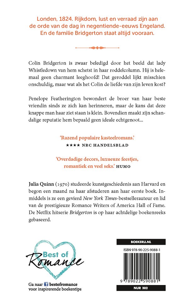 Colin Bridgerton is zwaar beledigd door het beeld dat lady Whistledown van hem schetst in haar roddelcolumn. Hij is helemaal geen charmant leeghoofd! Dat geroddel lijkt misschien onschuldig, maar wat als het Colin de liefde van zijn leven kost?