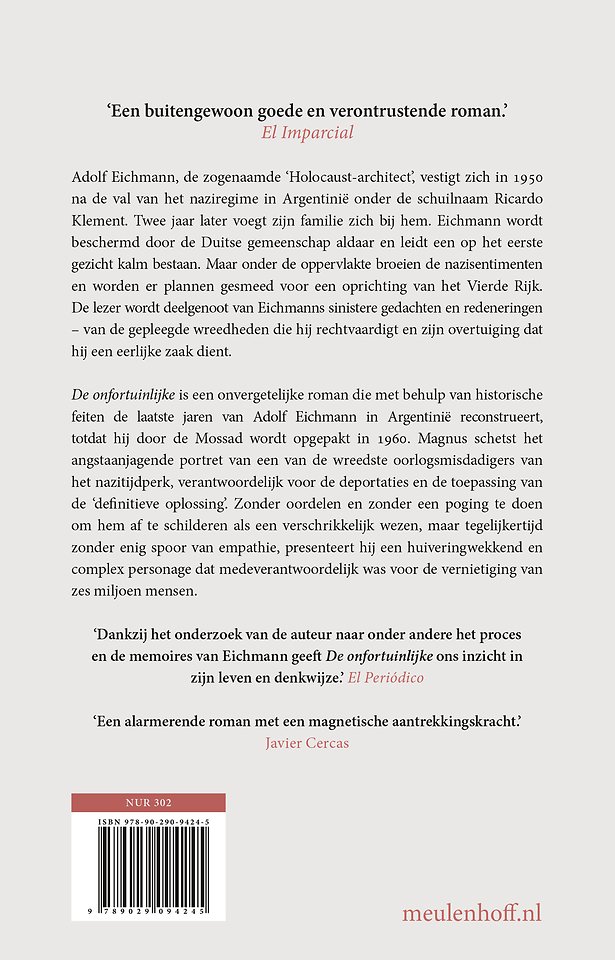 De onfortuinlijke is een onvergetelijke roman die met behulp van historische feiten de laatste jaren van Adolf Eichmann in Argentinië reconstrueert, totdat hij door de Mossad wordt opgepakt in 1960. Magnus schetst het angstaanjagende portret van een van de wreedste oorlogsmisdadigers van het nazitijdperk, verantwoordelijk voor de deportaties en de toepassing van de ‘definitieve oplossing’. Zonder oordelen en zonder een poging te doen om hem af te schilderen als een verschrikkelijk wezen, maar tegelijkertijd zonder enig spoor van empathie, presenteert hij een huiveringwekkend en complex personage dat medeverantwoordelijk was voor de vernietiging van zes miljoen mensen.