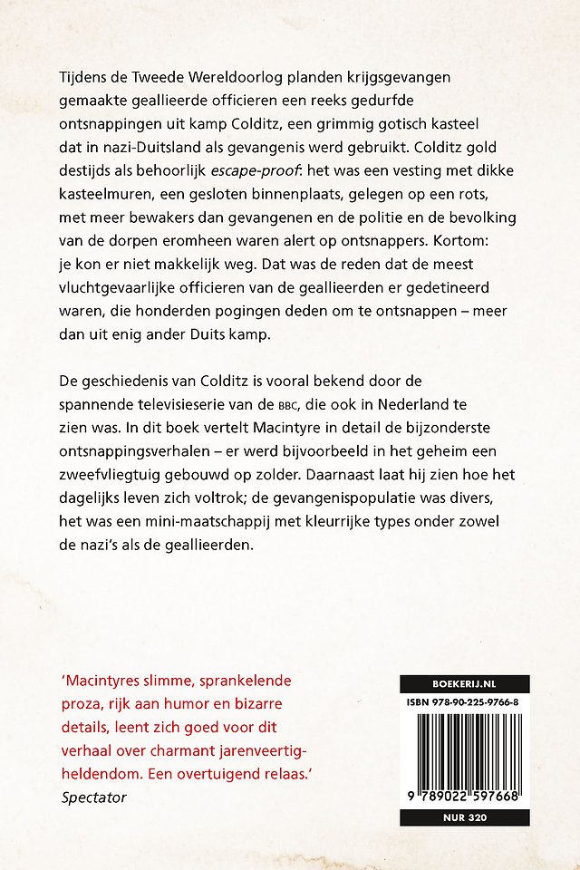 De geschiedenis van Colditz is vooral bekend door de spannende televisieserie van de bbc, die ook in Nederland te zien was. In dit boek vertelt Macintyre in detail de bijzonderste ontsnappingsverhalen – er werd bijvoorbeeld in het geheim een zweefvliegtuig gebouwd op zolder. Daarnaast laat hij zien hoe het dagelijks leven zich voltrok; de gevangenispopulatie was divers, het was een mini-maatschappij met kleurrijke types onder zowel de nazi’s als de geallieerden.