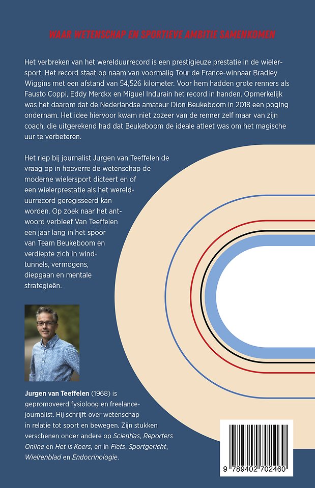 Waar wetenschap en sportieve ambitie samenkomenHet verbreken van het werelduurrecord is een prestigieuze prestatie in de wielersport. Het record staat op naam van voormalig Tour de France-winnaar Bradley Wiggins met een afstand van 54,526 kilometer. Voor hem hadden grote renners als Fausto Coppi, Eddy Merckx en Miguel Indurain het record in handen. Opmerkelijk was het daarom dat de Nederlandse amateur Dion Beukeboom in 2018 een poging ondernam. Het idee hiervoor kwam niet zozeer van de renner zelf maar van zijn coach, die uitgerekend had dat Beukeboom de ideale atleet was om het magische uur te verbeteren.Het riep bij journalist Jurgen van Teeffelen de vraag op in hoeverre de wetenschap de moderne wielersport dicteert en of een wielerprestatie als het werelduurrecord geregisseerd kan worden. Op zoek naar het antwoord verbleef Van Teeffelen een jaar lang in het spoor van Team Beukeboom en verdiepte zich in windtunnels, vermogens, diepgaan en mentale strategieën.Over Het maakbare uur'Hun poging faalde, maar leverde wel een geweldig sportboek op.' - De Correspontdent