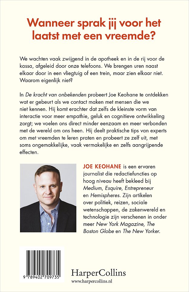 In 'De kracht van onbekenden' probeert Joe Keohane te ontdekken wat er gebeurt als we contact maken met mensen die we niet kennen. Hij komt erachter dat zelfs de kleinste vorm van interactie voor meer empathie, geluk en cognitieve ontwikkeling zorgt; we voelen ons direct minder eenzaam en meer verbonden met de wereld om ons heen. Hij deelt praktische tips van experts om met onbekenden te leren praten en probeert ze zelf uit, met soms ongemakkelijke, vaak vermakelijke en zelfs aangrijpende effecten.
