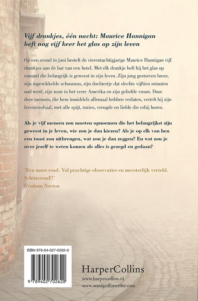 Op een avond in juni bestelt de vierentachtigjarige Maurice Hannigan vijf drankjes aan de bar van een hotel. Met elk drankje heft hij het glas op iemand die belangrijk is geweest in zijn leven. Zijn jong gestorven broer, zijn ingewikkelde schoonzus, zijn dochtertje dat slechts vijftien minuten oud werd, zijn zoon in het verre Amerika en zijn geliefde vrouw. Door deze mensen, die hem inmiddels allemaal hebben verlaten, vertelt hij zijn levensverhaal, met alle spijt, ruzies, vreugde en liefde die erbij horen.