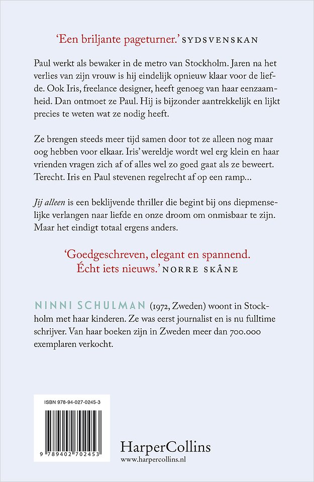 'Schulman maakt de term 'psychologische thriller' helemaal waar' - ???? TelegraafPaul werkt als bewaker in de metro van Stockholm. Jaren na het verlies van zijn vrouw is hij eindelijk opnieuw klaar voor de liefde. Ook Iris, freelance designer, heeft genoeg van haar eenzaamheid. Dan ontmoet ze Paul. Hij is bijzonder aantrekkelijk en lijkt precies te weten wat ze nodig heeft.Ze brengen steeds meer tijd samen door tot ze alleen nog maar oog hebben voor elkaar. Iris’ wereldje wordt wel erg klein en haar vrienden vragen zich af of alles wel zo goed gaat als ze beweert. Terecht. Iris en Paul stevenen regelrecht af op een ramp...Jij alleen is een beklijvende thriller die begint bij ons diepmenselijke verlangen naar liefde en onze droom om onmisbaar te zijn. Maar het eindigt totaal ergens anders.Over Jij alleen'Goedgeschreven, elegant en spannend. Écht iets nieuws.' - Norre Skåne'Op de cover prijkt, zoals wel vaker, de term 'psychologische thriller'. Vakt dekt die term de lading zeer ten dele maar Schulman maakt hem helemaal waar' - ???? Telegraaf'Pas op het eind wordt duidelijk wat er precies aan de hand is geweest. Of toch ook niet? Schulman heeft beslist een intrigerend verhaal bedacht dat de lezer meer dan eens op het verkeerde been zet.' - ??? VN Detective- en Thrillergids