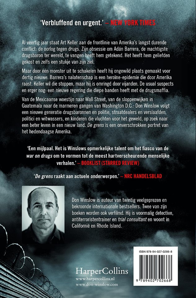 ???? NRCAl veertig jaar staat Art Keller aan de frontlinie van Amerika’s langst durende conflict: de oorlog tegen drugs. Zijn obsessie om Adán Barrera, de machtigste drugsbaron ter wereld, te vangen heeft hem getekend. Het heeft hem geliefden gekost en zelfs een stukje van zijn ziel.Maar door één monster uit te schakelen heeft hij ongewild plaats gemaakt voor dertig nieuwe. Barrera’s nalatenschap is een heroïne-epidemie die door Amerika raast. Keller wil die stoppen, maar hij is omringd door vijanden. De usual suspects en erger nog: een nieuwe regering die diepe banden heeft met de drugsmaffia. Van de Mexicaanse woestijn naar Wall Street, van de sloppenwijken inGuatemala naar de marmeren gangen van Washington D.C.: Don Winslow volgt een nieuwe generatie drugsbaronnen en politie, straatdealers en verslaafden, politici en witwassers, en kinderen die vluchten voor het geweld, op zoek naar een beter leven in een nieuw land. De grens is een onverschrokken portret van het hedendaagse Amerika.Over De grens‘De grens van Don Winslow aan het lezen (in mei in de winkel). Deze man is sensationeel goed. Een rauw en spectaculair boek. Favoriete passage tot nu toe: 'Wat is het verschil tussen een hedgefundmanager en een kartelbaas? De Wharton Business School.' - Stephen King'Met dit boek heeft Winslow de Amerikaanse ziel geraakt' - New York Times'De succesvolle Amerikaanse thrillerauteur is met ‘’De Grens’’ een stem geworden in het debat over drugs' - NRC Handelsblad‘De grens’ is uiterst verslavende lectuur, met een literaire straatwaarde waar de scenaristen van een seizoen ‘Narcos’ alleen maar van kunnen dromen. - HUMO BE'Dit spannende boek schetst een treurig beeld van een land waarin alles met de vorige president toch de goede kant op leek te gaan' - Gooi- en Eemlander'Winslow schildert - op basis van overheidsrapporten, rechtbankstukken en interviews met (ex-)gevangenen- een portret van hedendaags Amerika waar in de oorlog tegen drugs weinig hoop is.' - ????VN Detective- en Thrillergids'Dit boek lijkt door een expert op het gebied van de Mexicaanse drugshandel te zijn geschreven. De grote hoeveelheid details en beschrijvingen maken het verhaal zeer geloofwaardig.' - NBD Biblion'De scherpste analyse van de Amerikaanse war on drugs en de meest genadeloze filering van Donald Trumps beleid vind je niet in de Democratische verkiezingsfolders, maar wel in ‘De grens’, het derde deel van Don Winslows karteltrilogie en dé misdaadroman van het jaar.' - HUMODé misdaadroman van het jaar - ????½ HUMO BE'Wat De grens tot zo’n weergaloos boek maakt is dat Winslow het fiasco van de drugsaanpak vervlecht met een aantal persoonlijke verhalen.' - ???? NRC'Thriller van het jaar' - Sunday Times