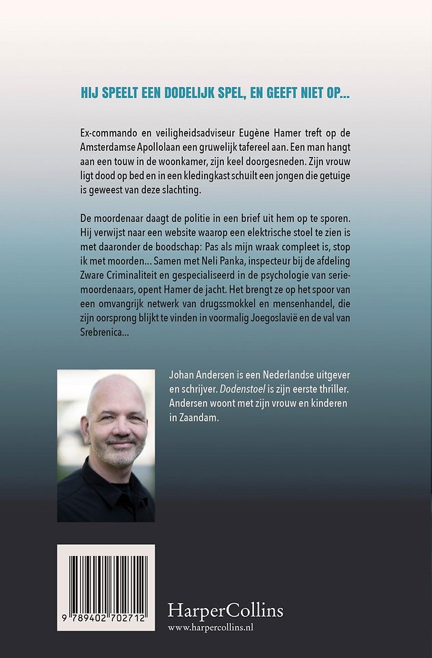 Hij speelt een dodelijk spel, en geeft niet op…Ex-commando en veiligheidsadviseur Eugène Hamer treft op de Amsterdamse Apollolaan een gruwelijk tafereel aan. Een man hangt aan een touw in de woonkamer, zijn keel doorgesneden. Zijn vrouw ligt dood op bed en in een kledingkast schuilt een jongen die getuige is geweest van deze slachting. De moordenaar daagt de politie in een brief uit hem op te sporen. Hij verwijst naar een website waarop een elektrische stoel te zien is met daaronder de boodschap: Pas als mijn wraak compleet is, stop ik met moorden... Samen met Neli Panka, inspecteur bij de afdeling Zware Criminaliteit en gespecialiseerd in de psychologie van seriemoordenaars, opent Hamer de jacht. Het brengt ze op het spoor van een omvangrijk netwerk van drugssmokkel en mensenhandel, die zijn oorsprong blijkt te vinden in voormalig Joegoslavië en de val van Srebrenica...Over Dodenstoel'Een meesterlijke thriller met Scandinavische allure, één van de beste die uw recensent de laatste tijd gelezen heeft.'- Leeskost