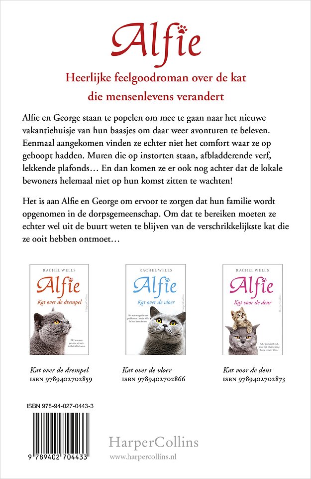 Alfie en George redden de vakantie van hun baasjesAlfie en George staan te popelen om mee te gaan naar het nieuwe vakantiehuisje van hun baasjes om daar weer avonturen te beleven. Eenmaal aangekomen vinden ze echter niet het comfort waar ze op gehoopt hadden. Muren die op instorten staan, afbladderende verf, lekkende plafonds… En dan komen ze er ook nog achter dat de lokale bewoners helemaal niet op hun komst zitten te wachten!Het is aan Alfie en George om ervoor te zorgen dat hun familie wordt opgenomen in de dorpsgemeenschap. Om dat te bereiken moeten ze echter wel uit de buurt weten te blijven van de verschrikkelijkste kat die ze ooit hebben ontmoet…Heerlijke feelgoodroman over de kat die mensenlevens verandert.