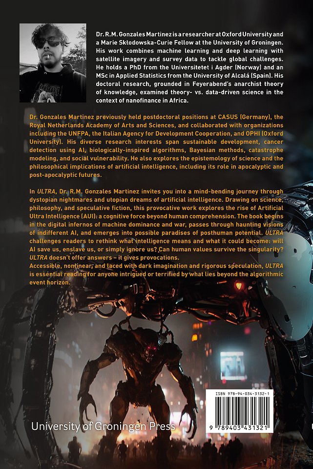 In ULTRA, R.M. Gonzales Martinez invites you into a mind-bending journey through dystopian nightmares and utopian dreams of artificial intelligence. Drawing on science, philosophy, and speculative fiction, this provocative work explores the rise of Artificial Ultra Intelligence (AUI): a cognitive force beyond human comprehension.