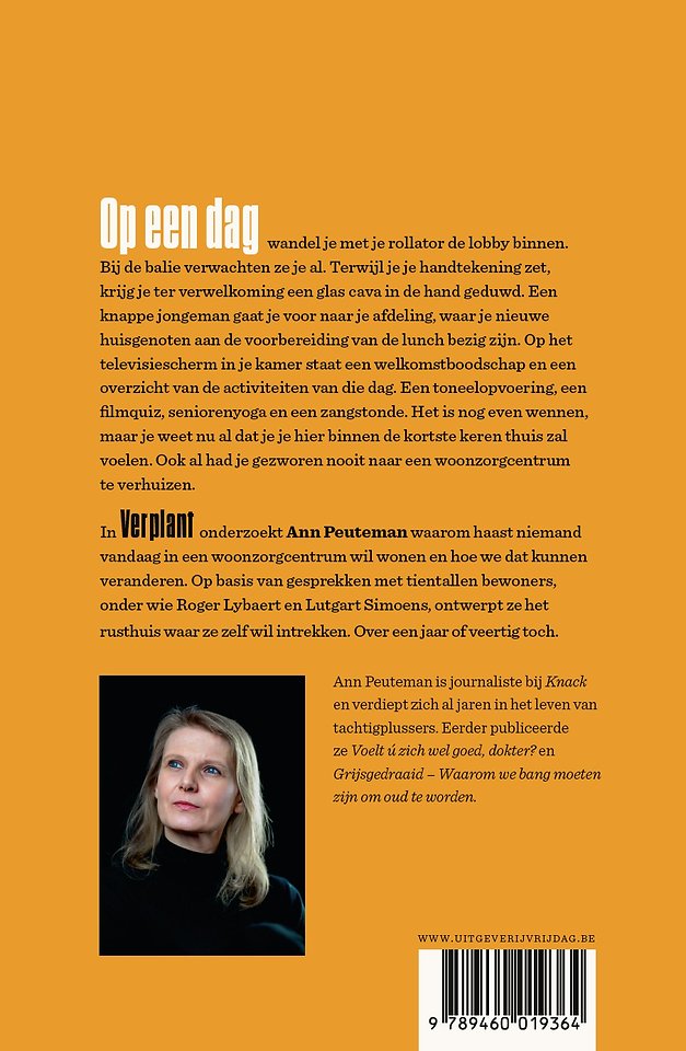 In 'Verplant' onderzoekt Ann Peuteman waarom haast niemand vandaag in een woonzorgcentrum wil wonen en hoe we dat kunnen veranderen. Op basis van gesprekken met tientallen bewoners, onder wie Roger Lybaert en Lutgart Simoens, ontwerpt ze het rusthuis waar ze zelf wil intrekken. Over een jaar of veertig toch.