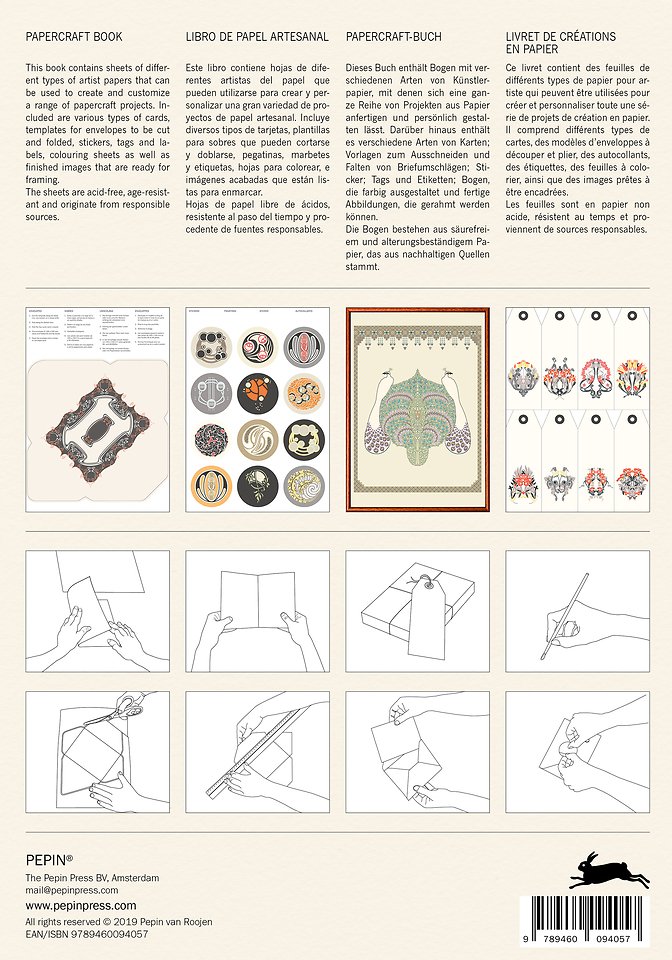 This book contains 50 sheets (=100 pages) of different types of artist papers that can be used to create and customize a range of papercraft projects. There is 1 sheet with text and 9 sheets with foldable cards, 8 sheets with templates for envelopes to be cut and folded, 4 sheets of sticker paper with total 48 stickers, 8 sheets 200gsm artist paper with 10 postcards , 4 gift-card cards and 24 gift tags. This section is perforated and die-cut; it should be easy to remove the cards and tags, the holes in the tags are punched out and the slots for the gift cards are cut. Furthermore 10 sheets with 14 colouring designs printed on thin grey lines and finally 10 sheets with pictures that are ready for framing (“frameable pictures”). The sheets are acid-free, age-resistant and originate from responsible sources.