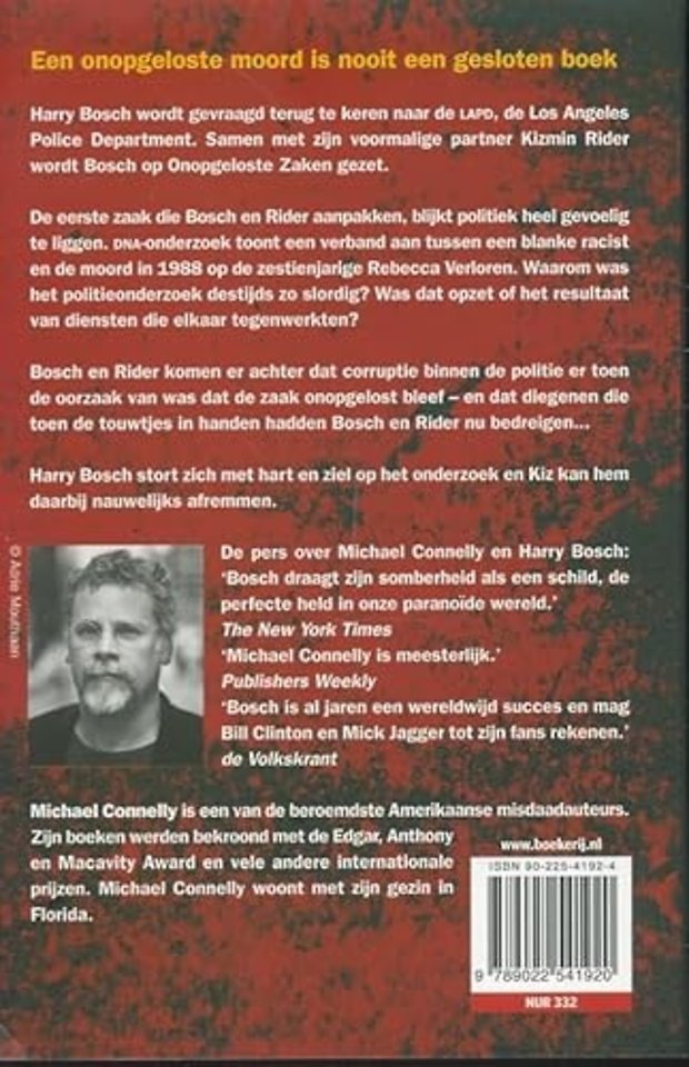 Harry Bosch en Kiz Rider gaan bij Onopgeloste Zaken werken. Hun eerste onderzoek blijkt meteen politiek gevoelig. DnA-sporen wijzen op betrokkenheid van een blanke racist bij de moord op de zestienjarige Rebecca Verloren. Waarom was het onderzoek in 1988 zo slordig? De toenmalige leiding wil het deksel op de beerput houden, maar Bosch laat zich niet stoppen.