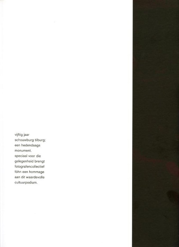 Een aantal maanden geleden nodigde de Tilburgse schouwburg en KunstpodiumT het fotografencollectief uit om te verbeelden wat hen opvalt, verrast, verwondert en inspireert aan de schouwburg in Tilburg. De fotografen Anjès Gesink, Claudia den Boer, Erik Klein Wolterink, Lisa Jacobs, Mariska van Zutven én Ria Kock maaktwen van het resultaat een speciale foto-expositie wat tot medio april te bezichtigen is in de foyer van de concertzaal. Vanwege alle feestelijkheden rondom de schouwburg is het werk uit de expositie gebundeld in een prachtig vormgegeven publicatie met daarin fotografie van ruimtes, monumentale vormen, mensen, passie en de factor tijd. Het boek geeft daarmee een kijkje achter de schermen van de schouwburg zoals het nu in Tilburg bestaat.
