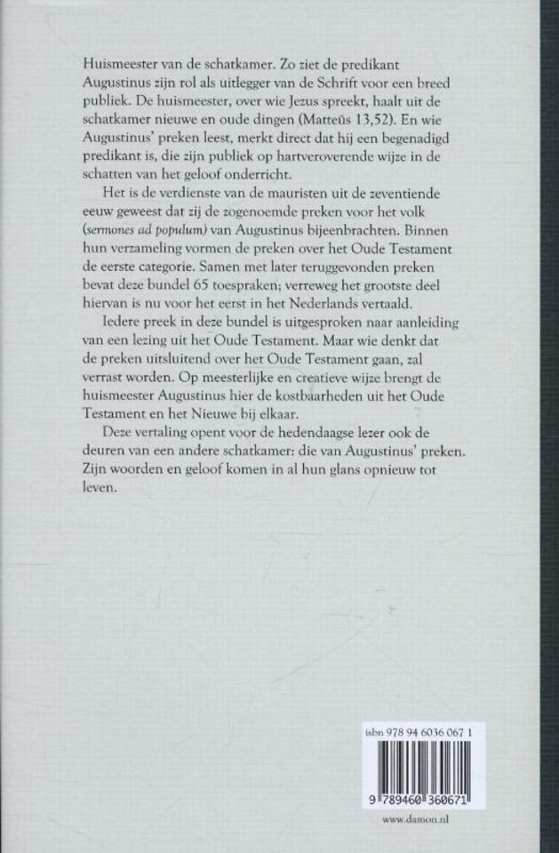 Iedere preek in deze bundel is uitgesproken naar aanleiding van een lezing uit het Oude Testament. Maar wie denkt dat de preken uitsluitend over het Oude Testament gaan, zal verrast worden. Op meesterlijke en creatieve wijze brengt de huismeester Augustinus hier de kostbaarheden uit het Oude Testament en het Nieuwe bij elkaar.