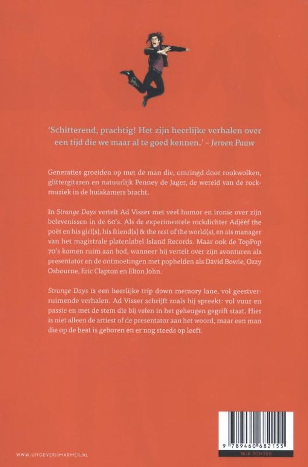 "Strange Days" is een geweldige trip down memory lane. Het boek omvat ruim 300 pagina's en is gevuld met hilarische, bizarre en geestverruimende verhalen. Ad Visser schrijft zoals hij spreekt: vol vuur, passie en met veel humor en ironie. Hier is niet alleen de artiest aan het woord of de presentator van het legendarische TopPop, maar ook de manager bij Phonogram en van de Nederlandse divisie van het platenlabel Island Records.