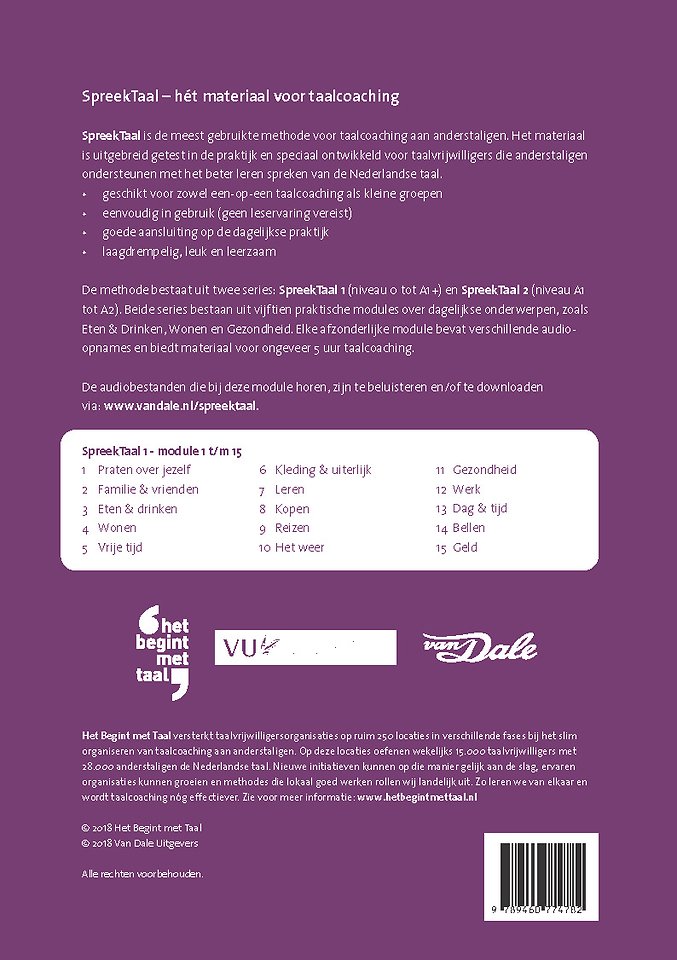 SpreekTaal is de meest gebruikte methode voor taalcoaching aan anderstaligen. Het materiaal is uitgebreid getest in de praktijk en speciaal ontwikkeld voor taalvrijwilligers die anderstaligen ondersteunen met het beter leren spreken van de Nederlandse taal.