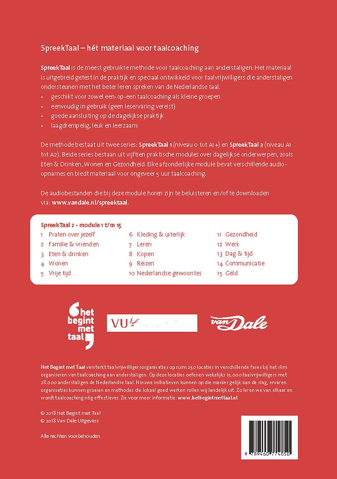 SpreekTaal is de meest gebruikte methode voor taalcoaching aan anderstaligen. Het materiaal is uitgebreid getest in de praktijk en speciaal ontwikkeld voor taalvrijwilligers die anderstaligen ondersteunen met het beter leren spreken van de Nederlandse taal.