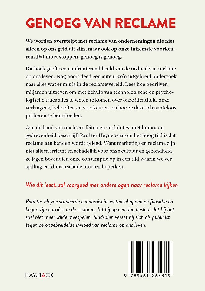Aan de hand van nuchtere feiten en anekdotes, met humor en gedrevenheid beschrijft Paul ter Heyne waarom het hoog tijd is dat reclame aan banden wordt gelegd. Want marketing en reclame zijn niet alleen irritant en schadelijk voor onze cultuur en gezondheid, ze jagen bovendien onze consumptie op in een tijd waarin we verspilling en klimaatschade moeten beperken.