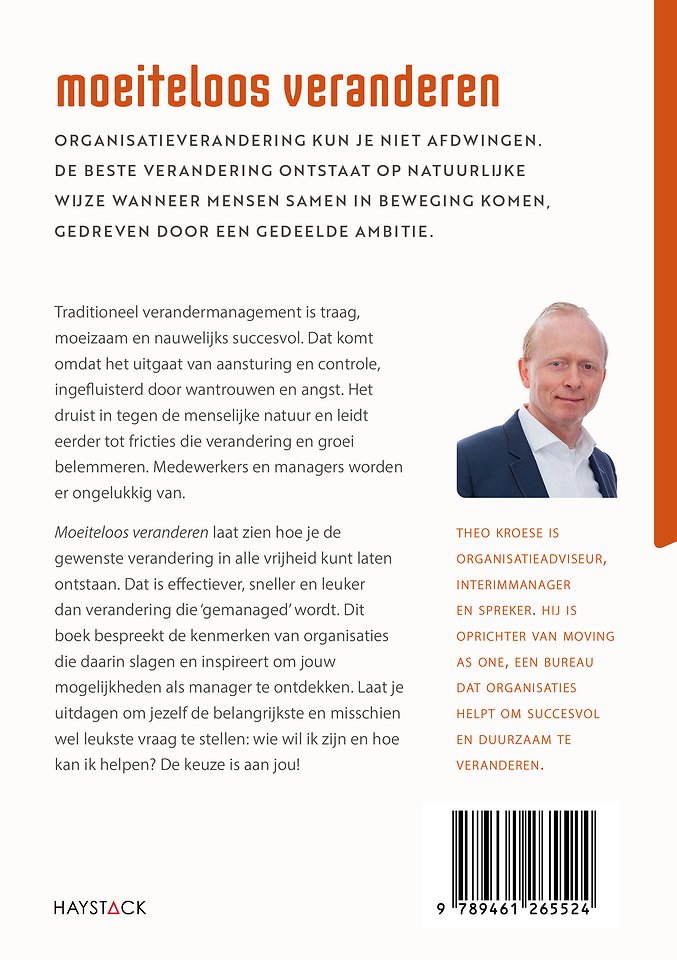 'Moeiteloos veranderen' laat zien hoe je de gewenste verandering in alle vrijheid kunt laten ontstaan. Dat is effectiever, sneller en leuker dan verandering die 'gemanaged' wordt. Dit boek bespreekt de kenmerken van organisaties die daarin slagen en inspireert om jouw mogelijkheden als manager te ontdekken. Laat je uitdagen om jezelf de belangrijkste en misschien wel leukste vraag te stellen: wie wil ik zijn en hoe kan ik helpen? De keuze is aan jou!