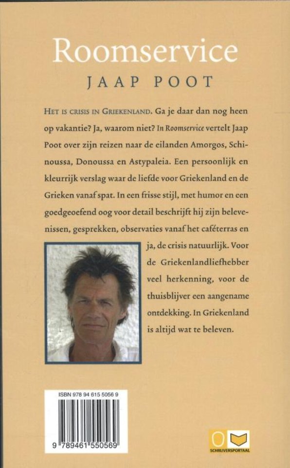 Al ruim veertig jaar reist oud-Delftenaar Jaap Poot naar Griekenland. "Het voelt als mijn tweede vaderland. Ik schrijf al jaren mijn belevenissen op in korte verhalen. Roomservice is het resultaat, een bundel van twintig grappige en herkenbare verhalen, waarin de zon blijft schijnen. Want crisis of geen crisis, Jaap Poot vindt Griekenland dé ultieme reisbestemming.
