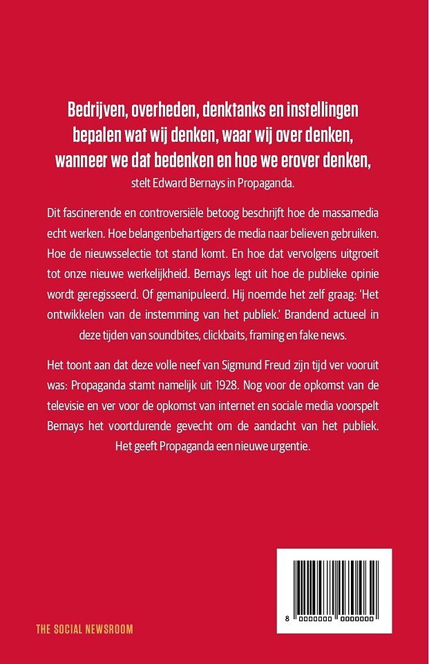 Hoe belangenbehartigers de media naar believen gebruiken. Hoe de nieuwsselectie tot stand komt. En hoe dat vervolgens uitgroeit tot onze nieuwe werkelijkheid. Bernays legt uit hoe de publieke opinie wordt geregisseerd. Of gemanipuleerd. Hij noemde het zelf graag ‘Het ontwikkelen van de instemming van het publiek.’ Brandend actueel in deze tijden van soundbites, clickbaits, framing en fake news.