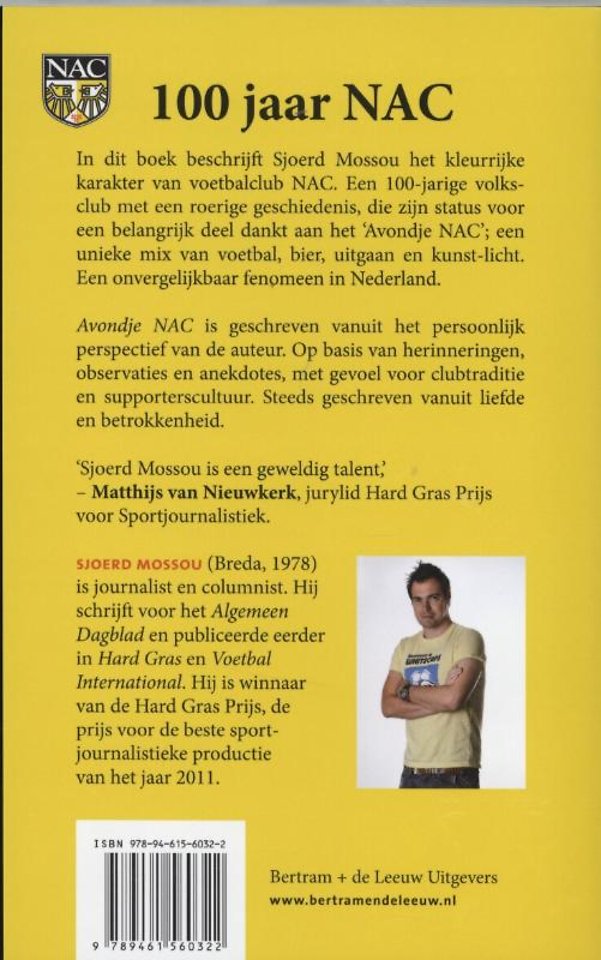 In dit boek beschrijft Sjoerd Mossou het kleurrijke karakter van de voetbalclub NAC. Een 100-jarige volksclub met een roerige geschiedenis, die zijn status voor een belangrijk deel dankt aan het 'Avondje NAC'; een buitengewone mix van voetbal, bier, uitgaan en kunstlicht. Een uniek fenomeen in Nederland.